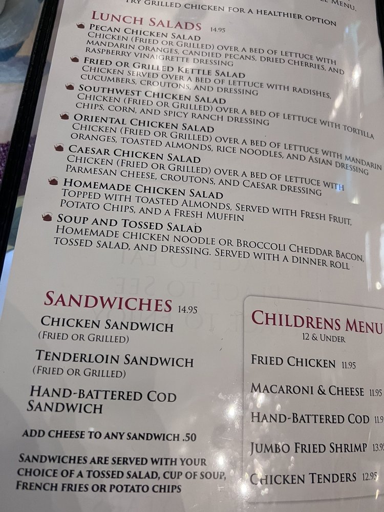 Introducing the menu at Kopper Kettle Inn Restaurant, a soul food, steakhouse, and seafood eatery located at 135 W Main St Morristown, IN. This restaurant offers a variety of options such as shrimp cocktail appetizers, golden pan-fried chicken, poached haddock, French fried shrimp, catfish fillet, and more. The house specialties include the famous golden pan-fried chicken, chicken liver dinner, and hand-battered cod dinner. From the broiler, you can enjoy filet mignon with blue cheese dressing, ribeye steak, and New York strip steak. The restaurant also provides a range of amenities, including wheelchair accessibility, outdoor seating, free Wi-Fi, full bar, and happy hour specials. With a diverse menu and an array of dining options, Kopper Kettle Inn Restaurant is a must-visit for those craving delicious soul food and seafood dishes.